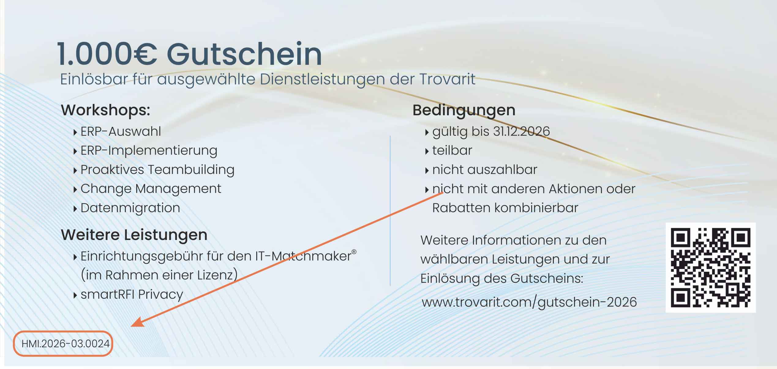 Der Gutschein hat einen Wert von 1.000 €. Der Betrag wird mit der gewählten Leistung verrechnet. Eine Einlösung in Teilbeträgen ist möglich, bis der Gutscheinwert vollständig ausgeschöpft ist.